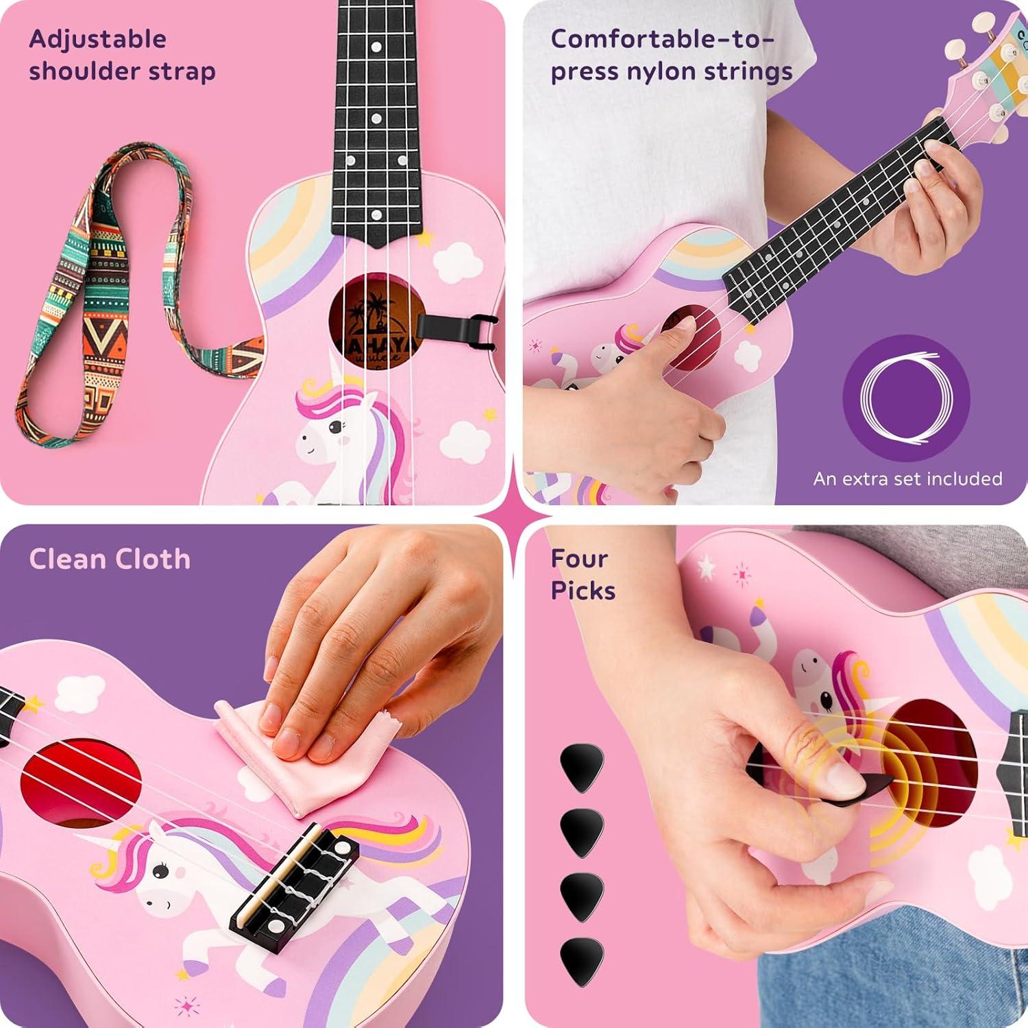 All-in-one Ukulele Beginner Set: To offer a better learning experience, the ukulele comes with shoulder strap,carrying bag, cleaning cloth 4 extra nylon strings and 4 picks. Nylon strings are easier for beginners to play, speeding up the learning process, while the shoulder strap provides a more comfortable playing posture, allowing players to enjoy music for longer periods.