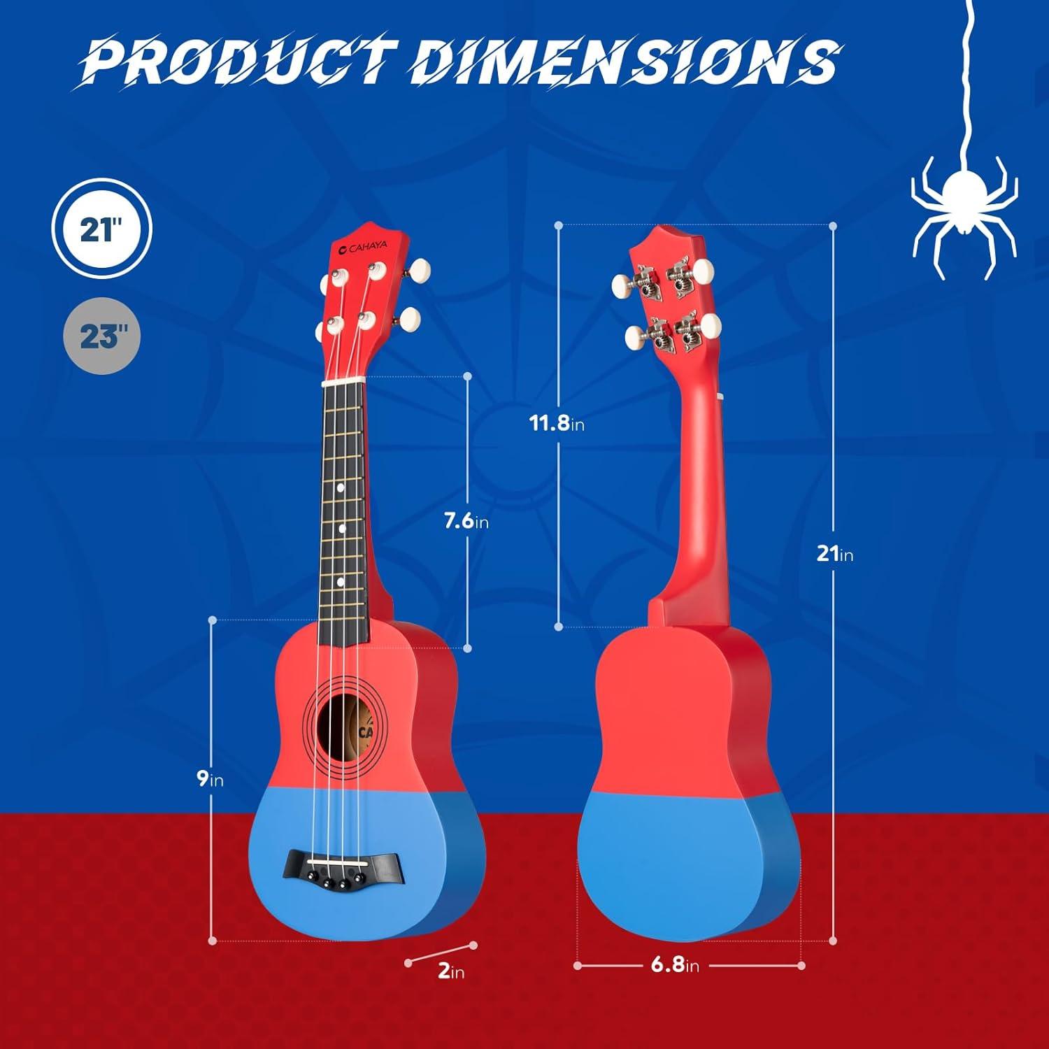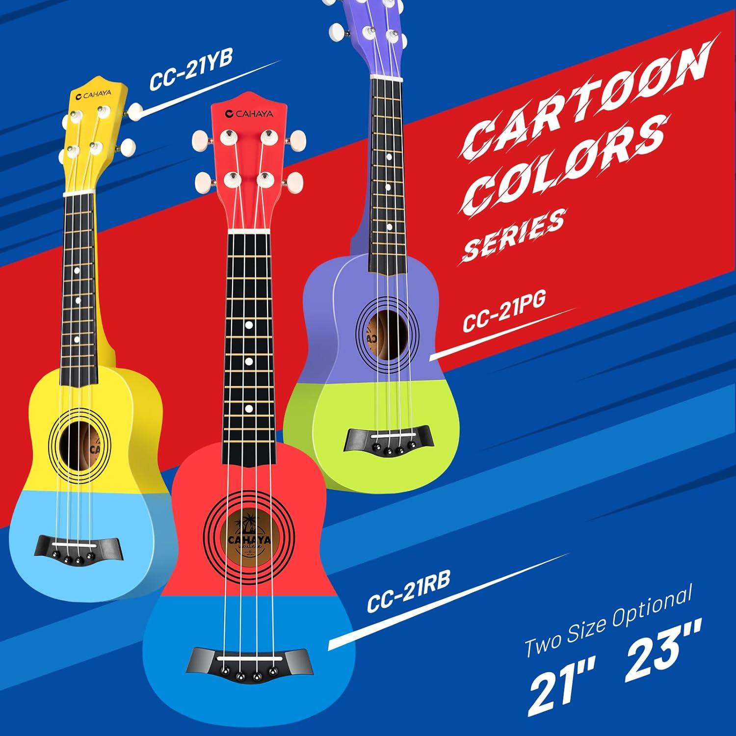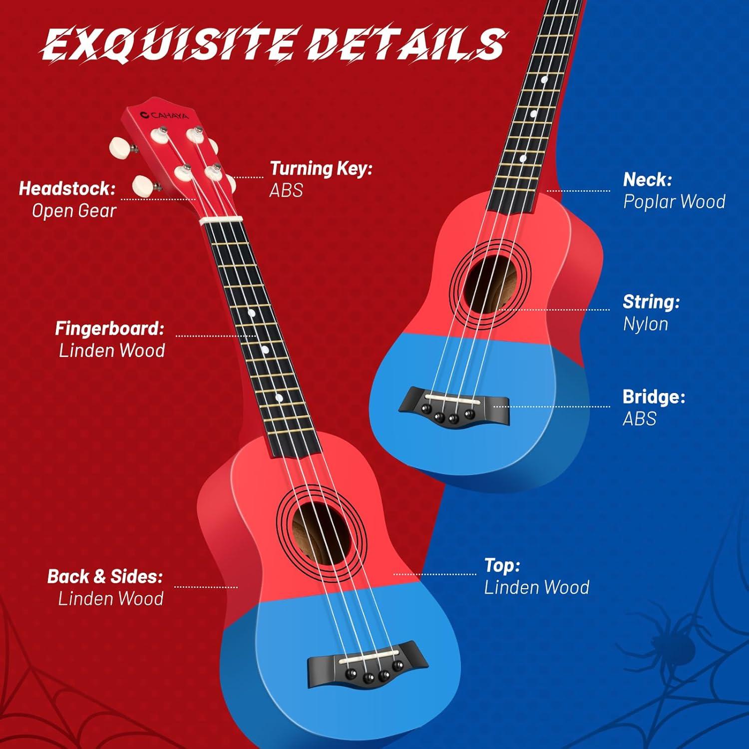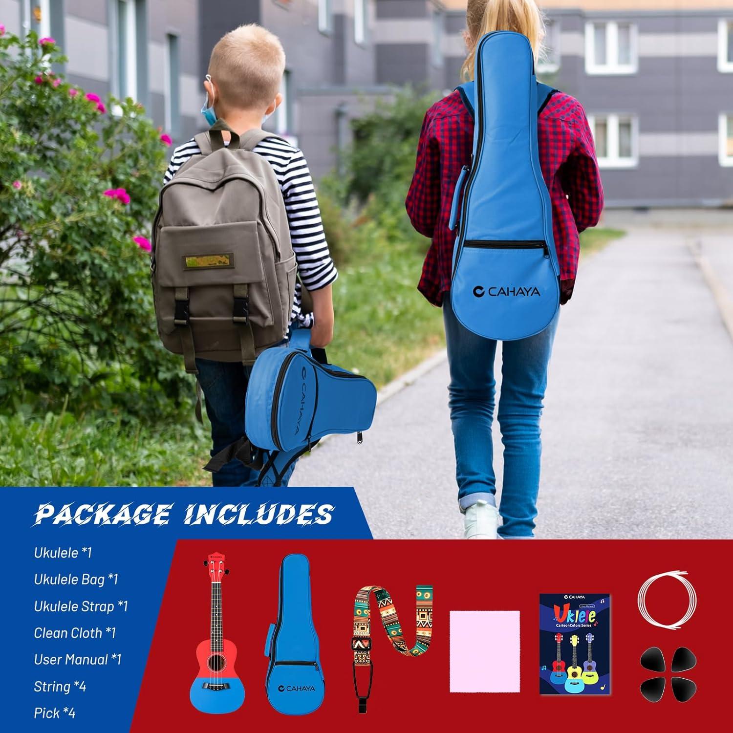 CAHAYA 21-Inch Cartoon-themed Mahogany Soprano Ukulele Beginner Kit with Gig Bag, Colorful Strap, and Fretboard Stickers—Perfect for Kids and Adults, Professional Hawaiian Ukulele Gift(Red-Blue)