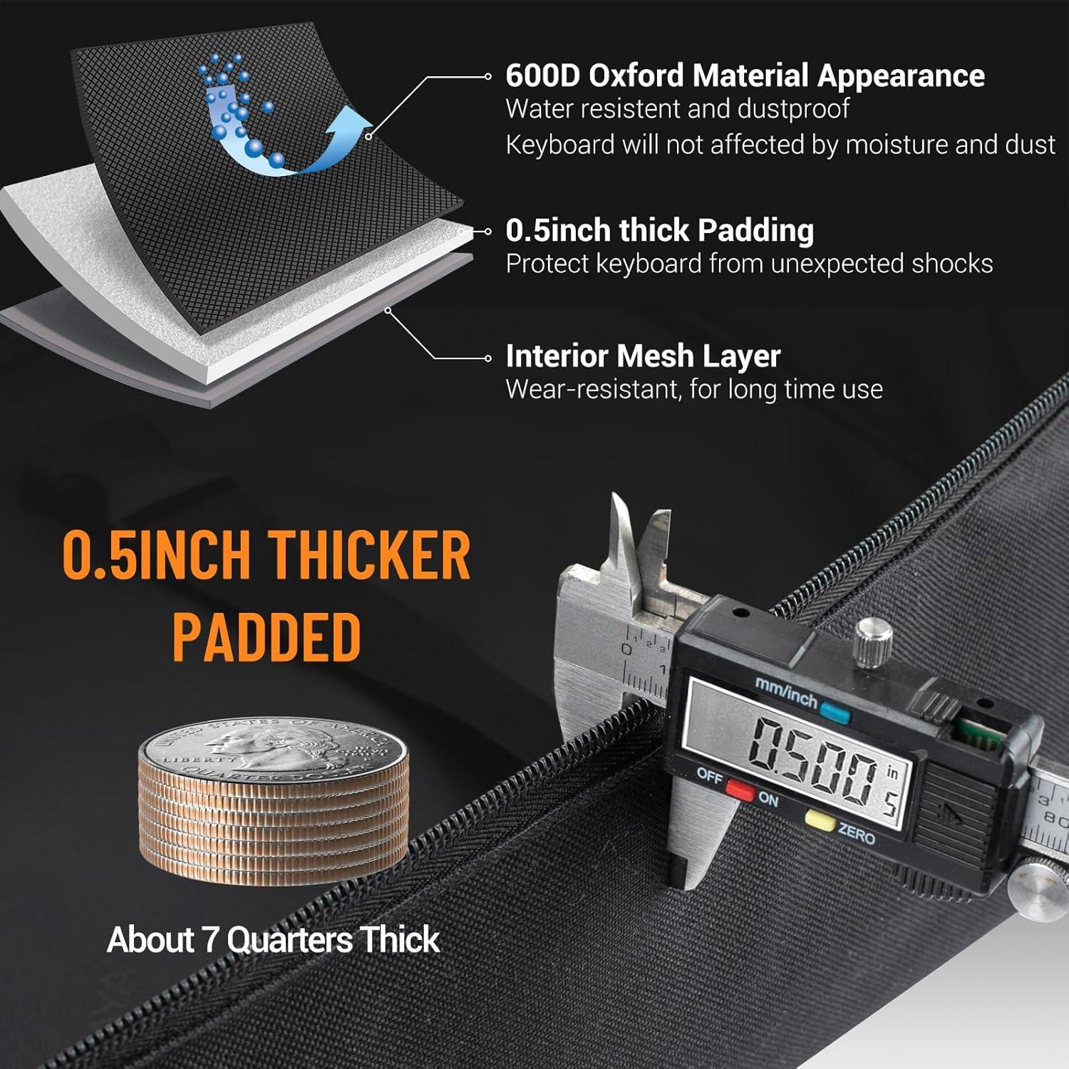 Interior Size: 38.9″ x 17.2″ x 6.3″. The 61 keyboard bag is fit for most popular model 61 key keyboards. Heavy duty 600d oxford cloth is very thick and not easy to tear. 12 mm/0.5inch padding is thicker than other keyboard bags. Effectively protect keyboard from unexpected shocks.