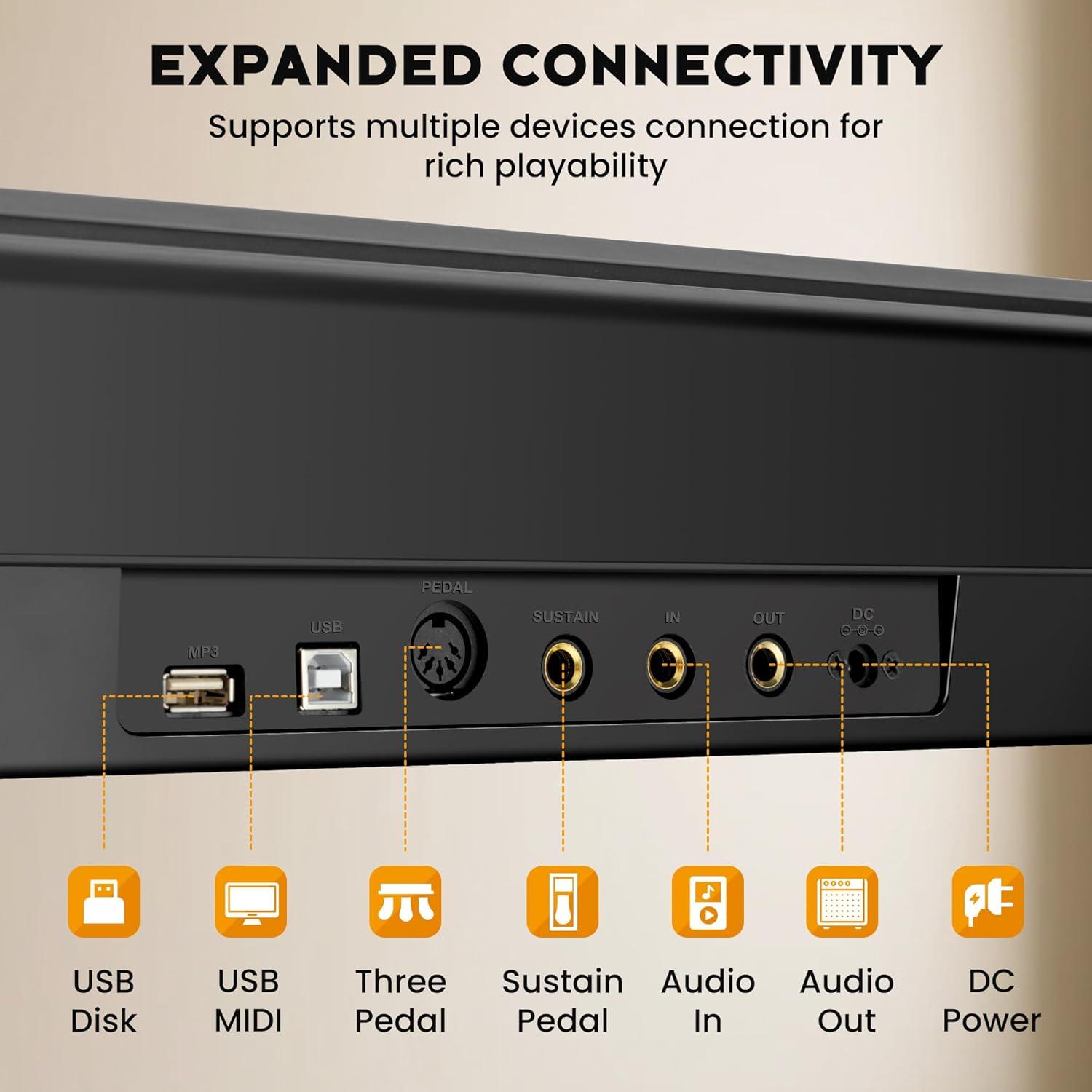 Versatile Functionality: The Keyboard piano for beginners supports MIDI connectivity for music editing or recording with external devices such as computers. It also supports sustain pedal, MP3, microphone, headphone, and USB connections enabling immersive practice sessions without disturbing others.