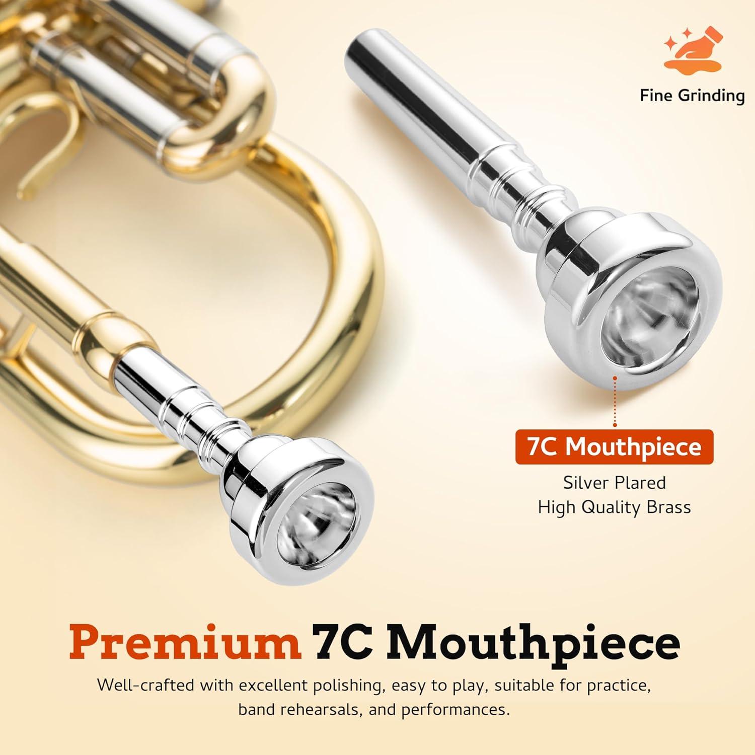 CAHAYA Bb Standard Trumpet Set: CAHAYA trumpet set includes: 1*Trumpet, 1*7C Mouthpiece, 1*Gloves, 1*Cleaning Kit, 1*Clean Cloth, 1*Hard Case. The 7C mouthpiece makes playing more comfortable. It provides everything a beginner needs in one package, making your musical journey easy to start.