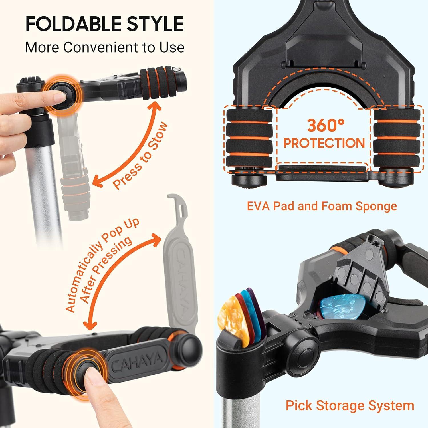 Automatic Neck Fixing Buckle: There is an automatic flip lock on the head of this guitar stand, which automatically springs when you press it lightly. In addition, there is a very small storage compartment on the head of the guitar stand, which can store various picks.