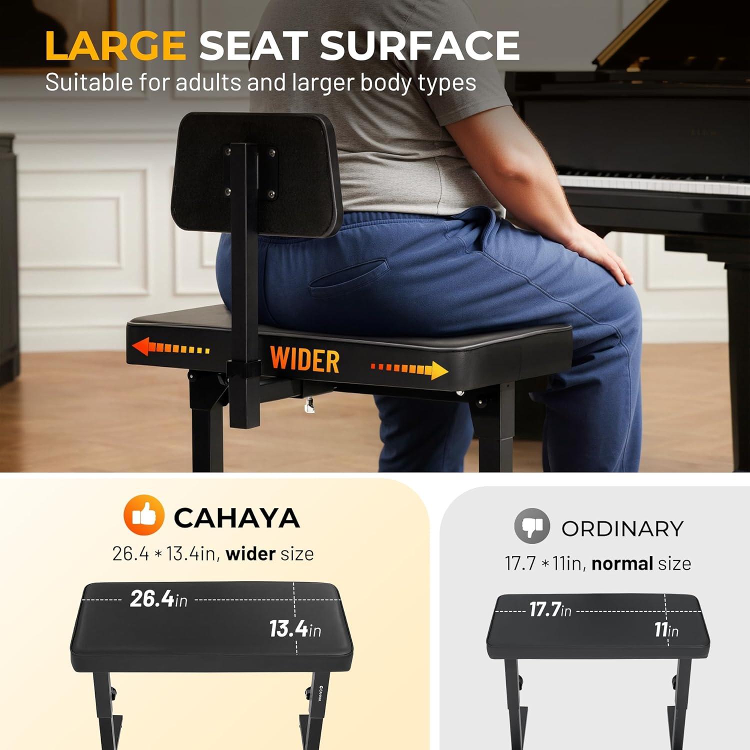 Ultra-Comfortable Wide Seat: Experience exceptional comfort during long practice sessions with our 26.4″*13″ (67cm*33cm) extra-wide cushioned seat. The 2.4″(62mm) high-density foam padding and 440 lb(200kg) weight capacity provide superior support for duet performances or larger players.