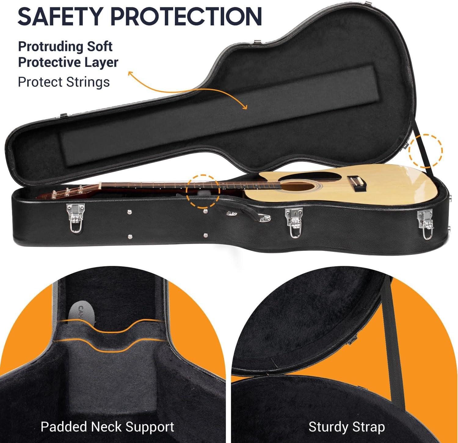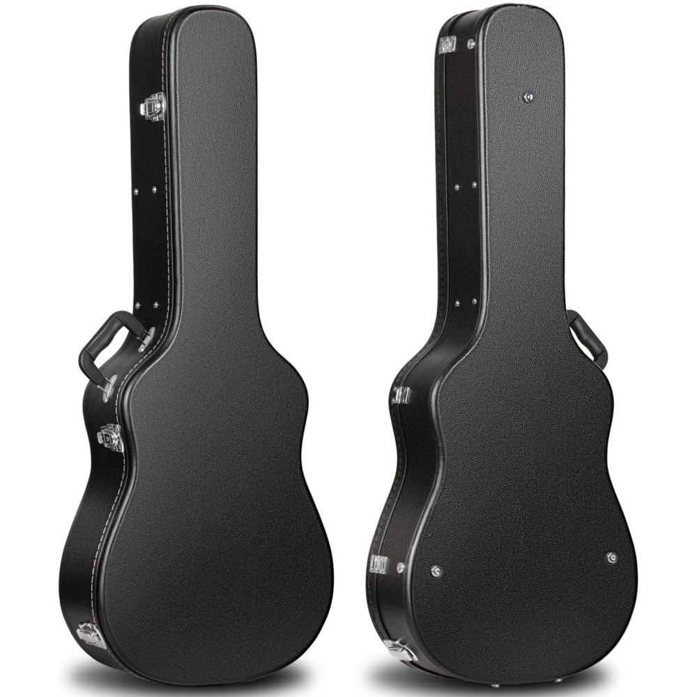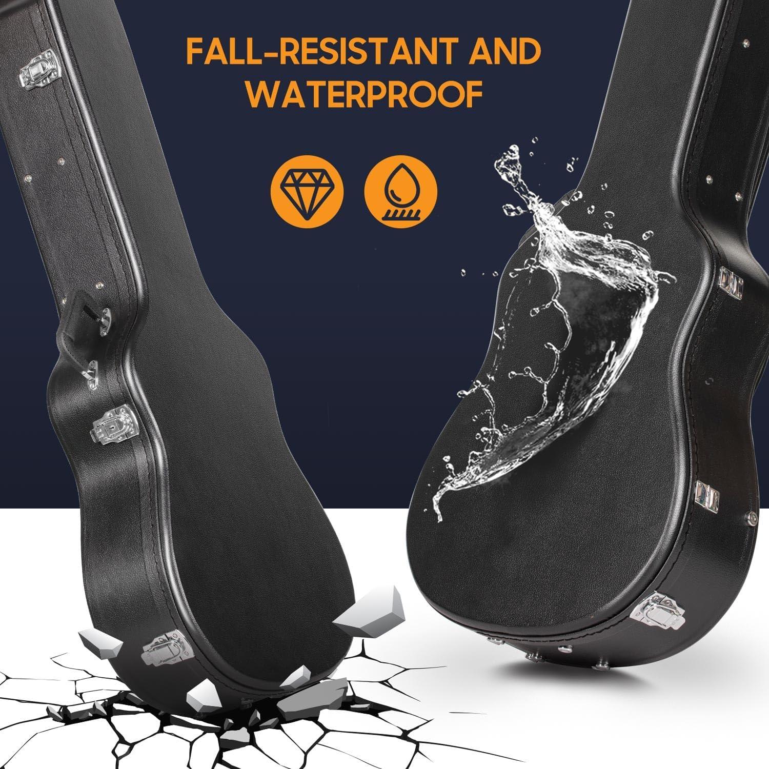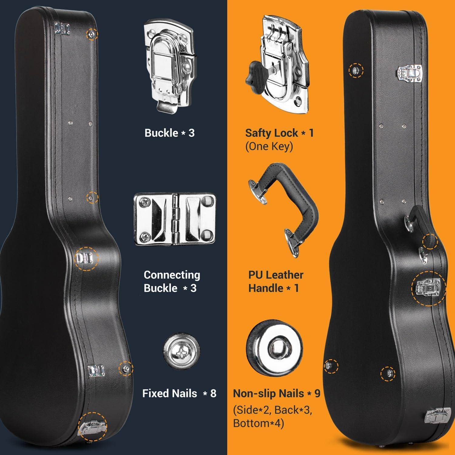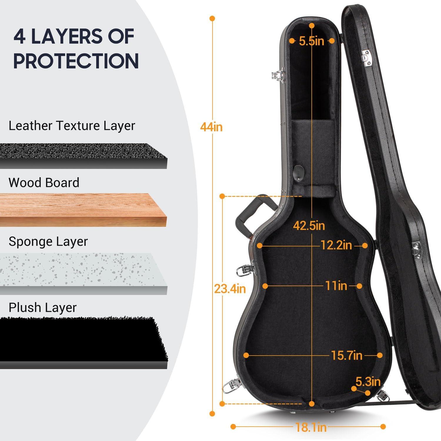 4 Layers of Protection: Our guitar cases are made of leather, wood, sponge, thick padding, is light and strong, protect your precious guitar from the inside to the outside. Has premium durability and impact-resistant. Stands up to years of use and abuse. Interior Dimensions: Overall Length: 44.8” Upper Bout Width: 11.8” Middle Bout Width: 10.8” Lower Bout Width: 16.9”.