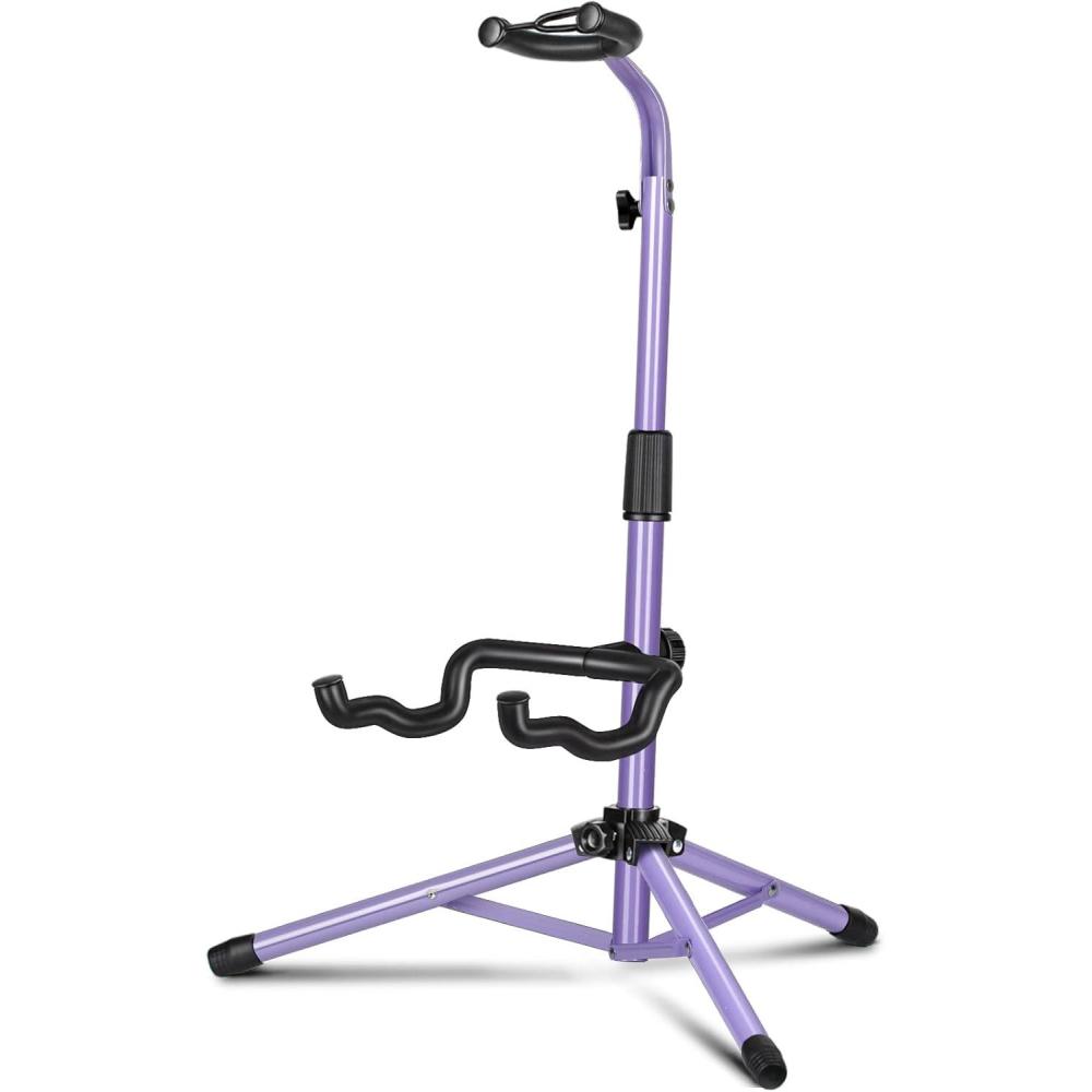 Umbrella-Shaped Structure Sturdy Base: We add three thick metal support bars to the base to provide additional support for the entire guitar stand. Tripod legs extend farther outwards for a steadier footing. Anti-slip rubber feet to hold a firm grip on the floor. Once the guitar stand is installed and put the guitar in place, it will be very stable and has no chance of falling over. The height of the base is adjustable from 5.1″-8.7″.