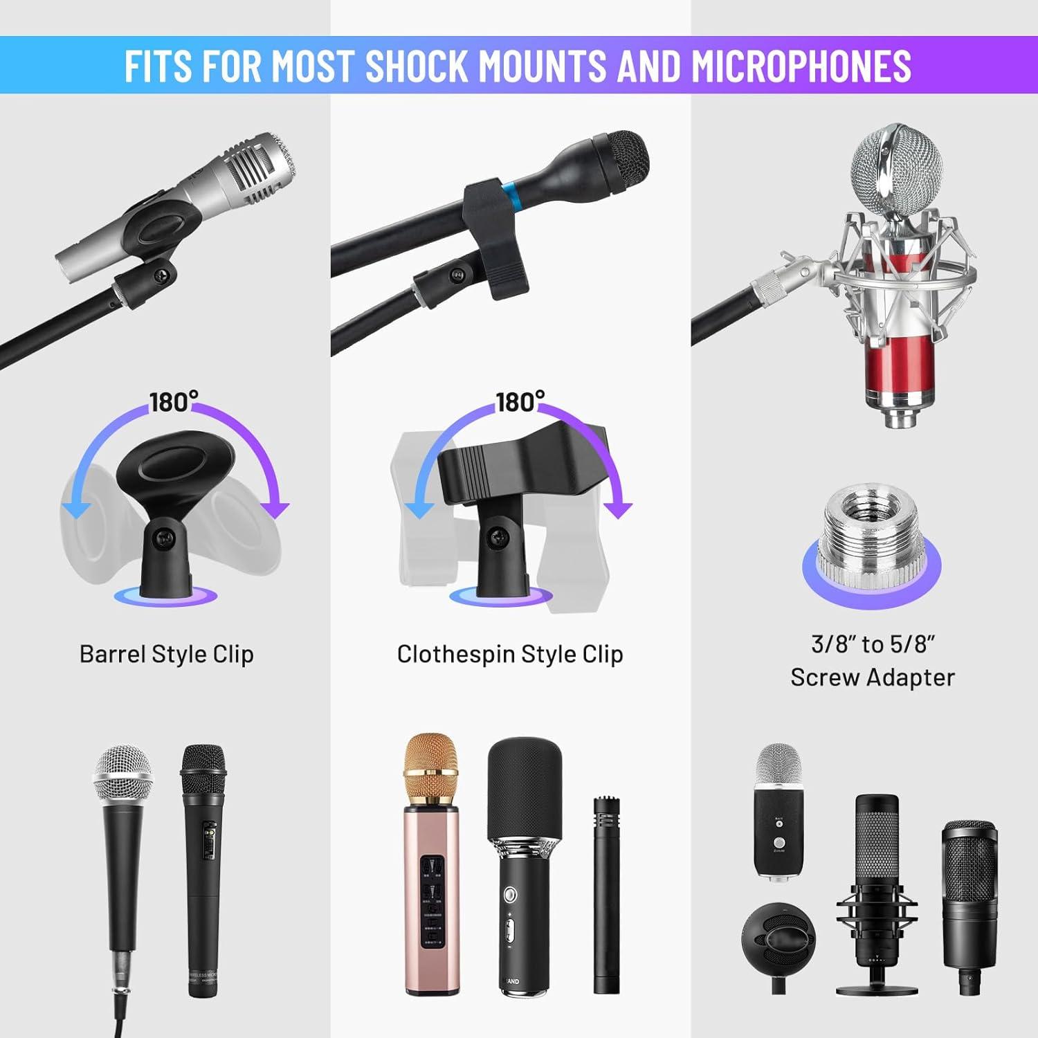 2-IN-1 DESKTOP MIC STAND: Simply remove the boom arm and attach the mic clip to convert the boom microphone stand to a straight mic stand. It also comes with 2 types of microphone clips which allow you to fit most types of microphones. Perfect for meeting, speech, video conference etc.