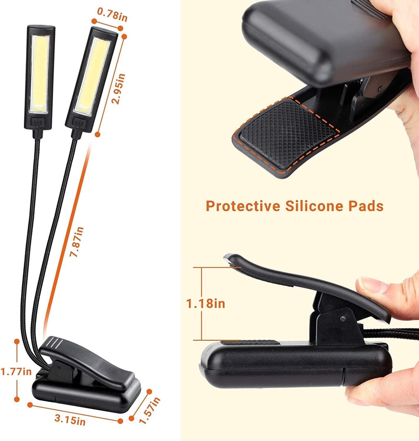 Dual Arms Flexible & 3-Level Brightness : Dual arms flexible for precise adjustment. Adjust its position the way you want! Non-flickering lamp beads protect your eyes and are bright enough to illuminate an entire sheet of paper or book. 3 levels of brightness are available through a power switch on each lamp holder.