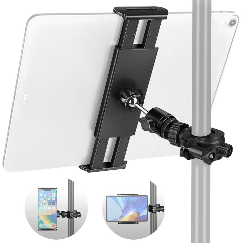 Our adjustable mount holder fits smartphones and tablets from 5.9” to 12.9”, ensuring compatibility with or without cases. Designed for convenient charging and scratch protection, it offers 360° rotation and tilt flexibility for optimal visibility. With a secure grip on poles ranging from 0.65 to 1.3 inches in diameter, installation is tool-free and hassle-free, perfect for mic stands, music stands, and more.
