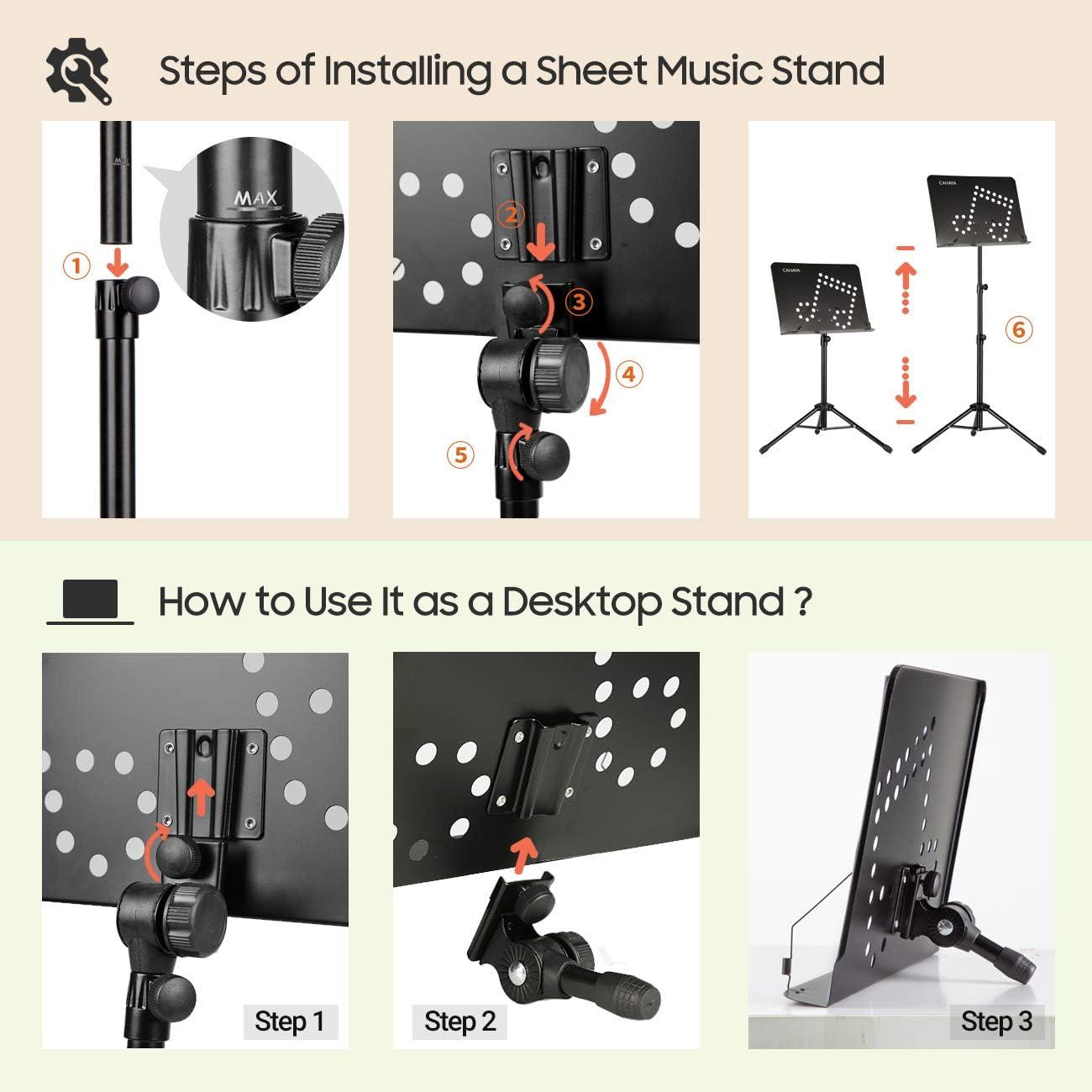 Dual Use Foldable Music Stand & Tabletop Stand: extra desktop support enables using it as a table top sheet music books stand. Easy to assemble and disassemble. Perfect for musical instruments play such as guitars, violin, drums.