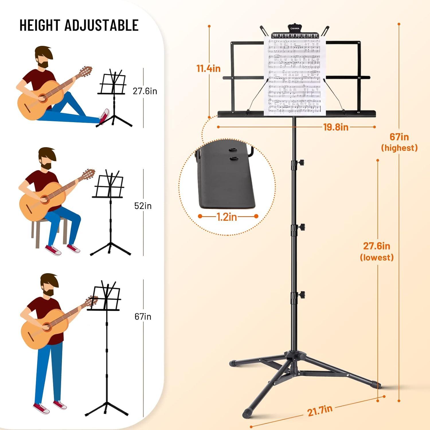 VERSATILE AND ADJUSTABLE FOR ANY SETUP: CAHAYA foldable music stand is designed for both sitting and standing positions. It features height adjustment from 27.6″ to 51.2″ and a 180 degrees adjustable angle tilting bookplate, allowing you to find the perfect viewing angle for your sheet music. Whether you need it for home, class, or performance, this stand adapts to your needs with ease.