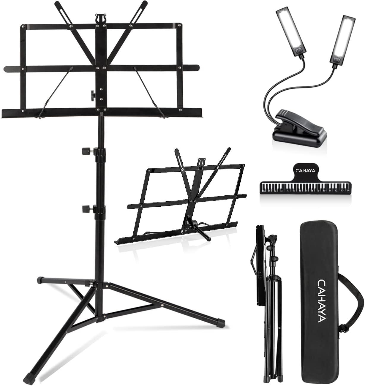 CAHAYA Portable Sheet Music Stand: Dual Use Desktop Book Holder Folding Lightweight Extra Stable Reinforced with Carrying Bag and Clip for Students Musicians Height Adjustable up to 54.3" CMS0204(Black)