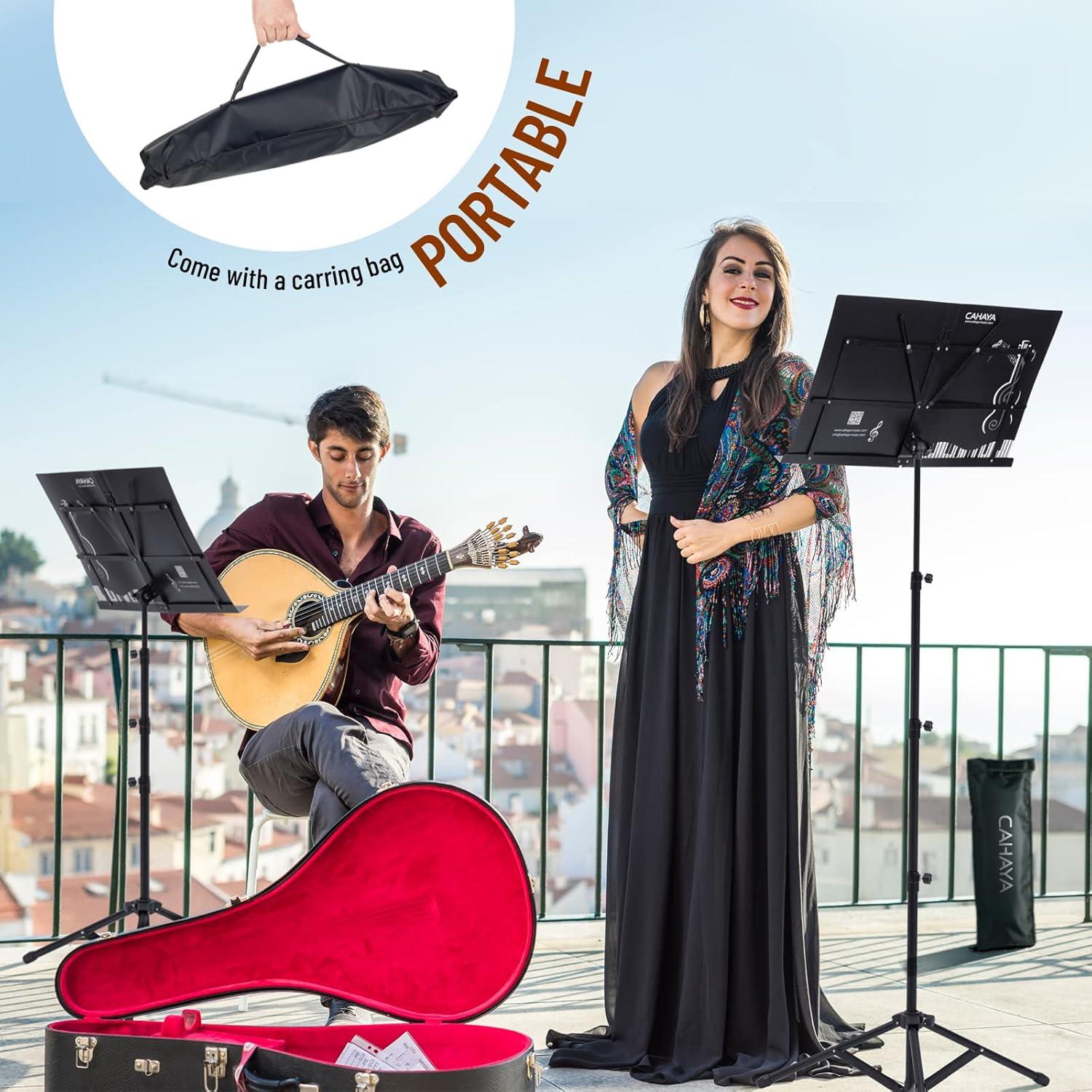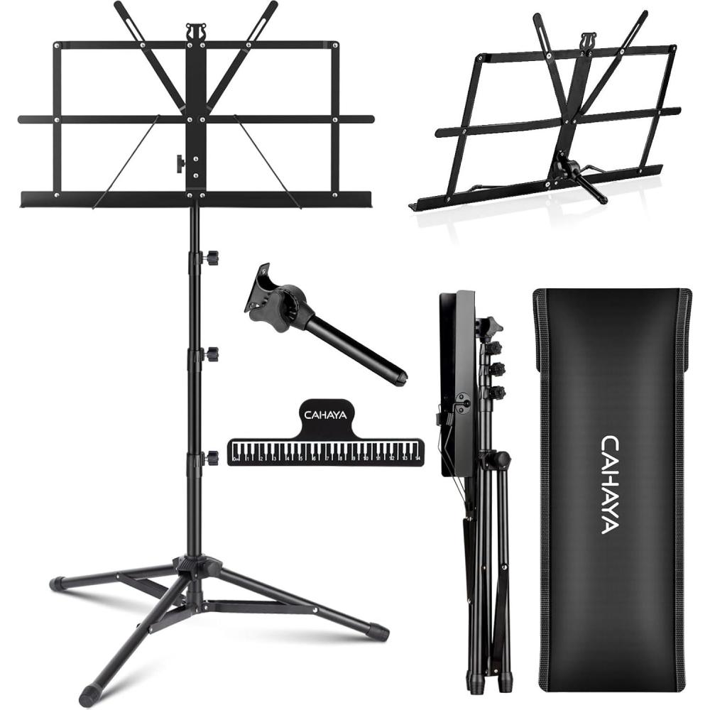 CAHAYA Portable Sheet Music Stand: Dual Use Desktop Book Holder Folding Lightweight Extra Stable Reinforced with Carrying Bag and Clip for Students Musicians Height Adjustable up to 54.3″ CMS0204(Black)