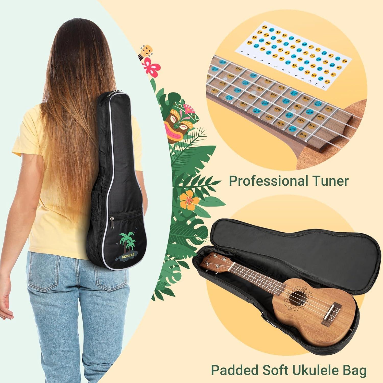 All-in-one Ukulele Beginner Set: To offer a better learning experience, the ukulele comes with fret stickers and a shoulder strap. The fret stickers help beginners accurately find finger placements, speeding up the learning process, while the shoulder strap provides a more comfortable playing posture, allowing players to enjoy music for longer periods.