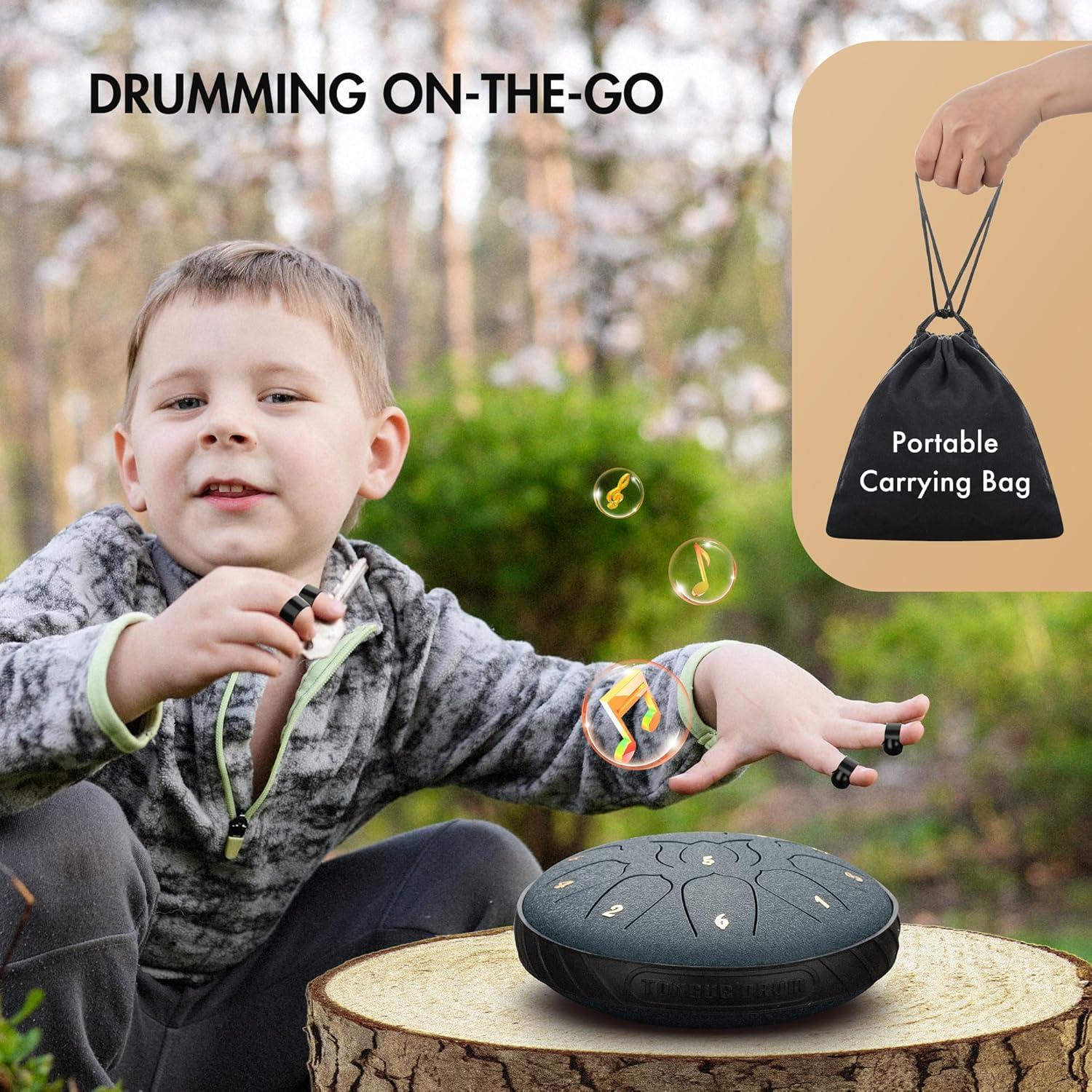 Package Includes: 1* steel tongue drum, 1* drum carry bag, 2* drumsticks, 1* drumstick holder, 1* music book, 1* spare notes, 4* finger pads, 2* note stickers and 1* wiping cloth.