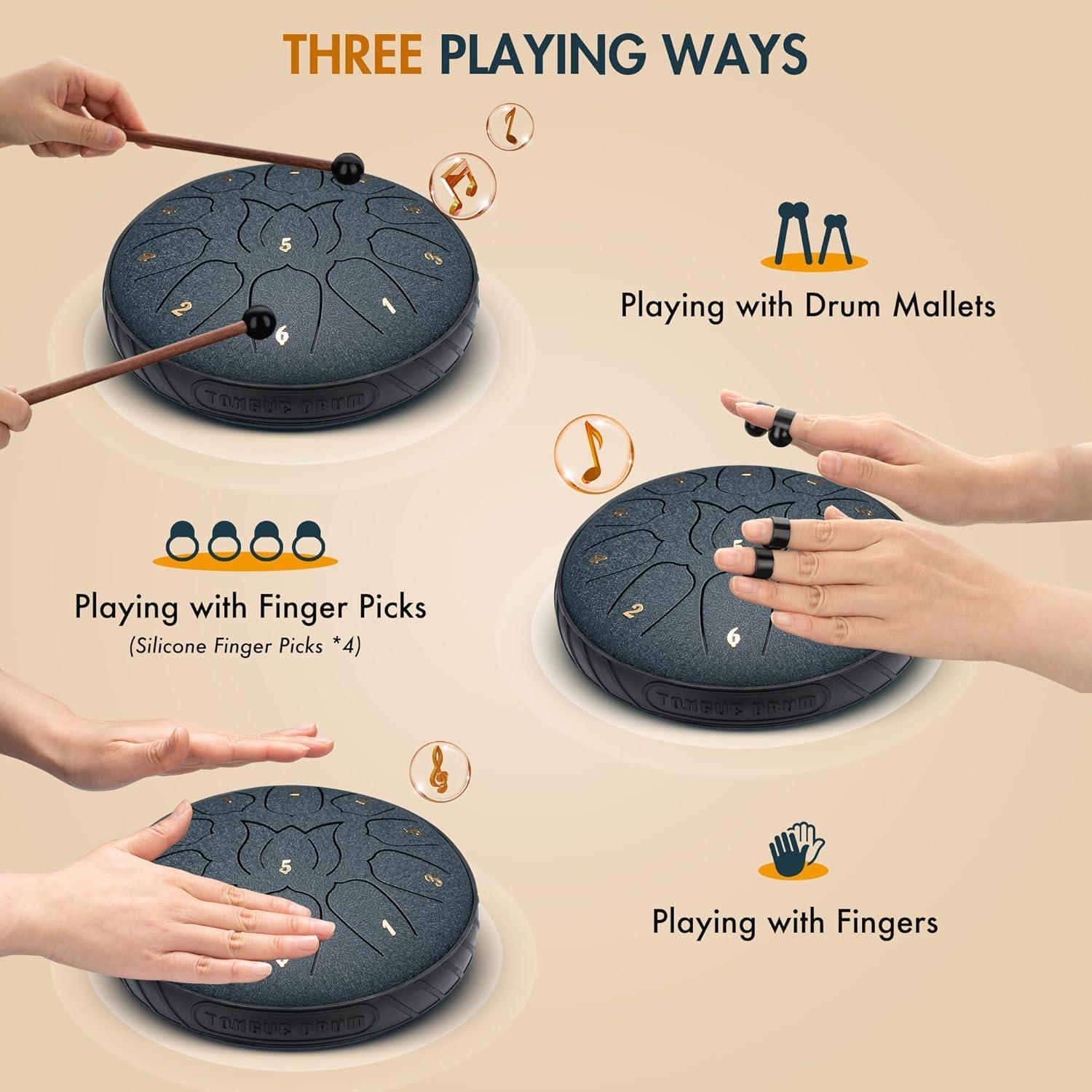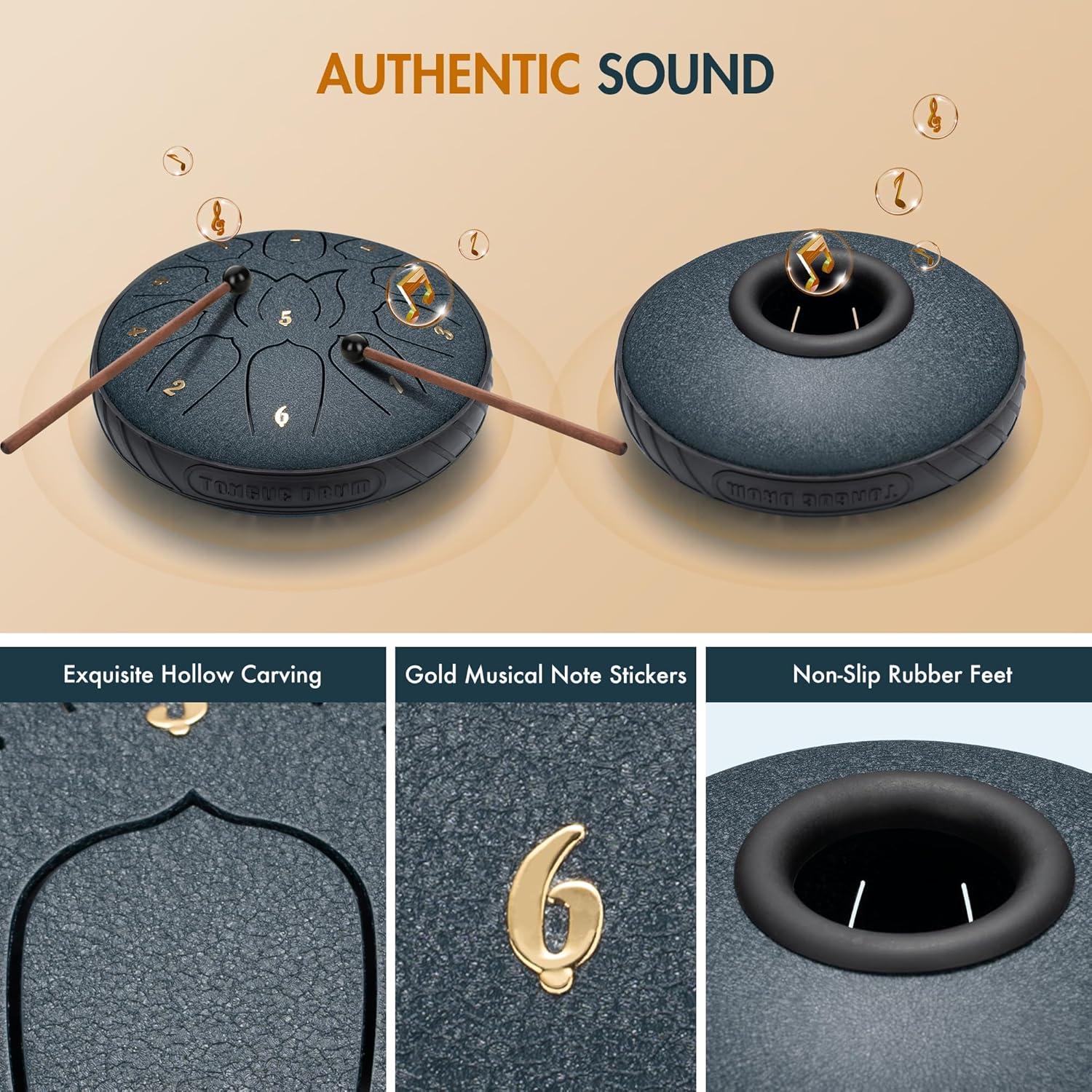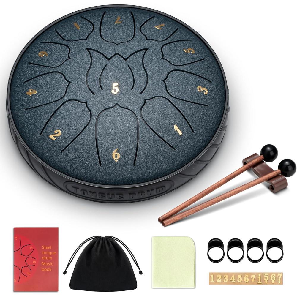 imageCAHAYA Steel Tongue Drum Set 6 Inch 8 Notes Steel Hand Drum with Music Book Drum Mallets Finger Paddles and Carry Bag for Kids Gift Musical Education Meditation Yoga CY0359Navy blue11 tones