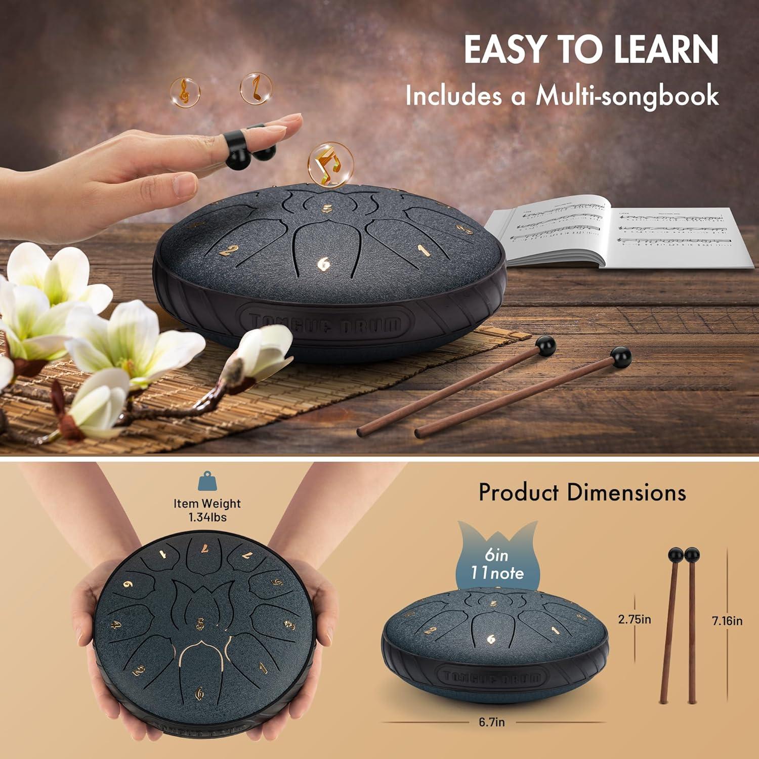 CAHAYA Steel Tongue Drum Set 6 Inch 8 Notes Steel Hand Drum with Music Book Drum Mallets Finger Paddles and Carry Bag for Kids Gift Musical Education Meditation Yoga CY0359(Navy blue(11 tones))