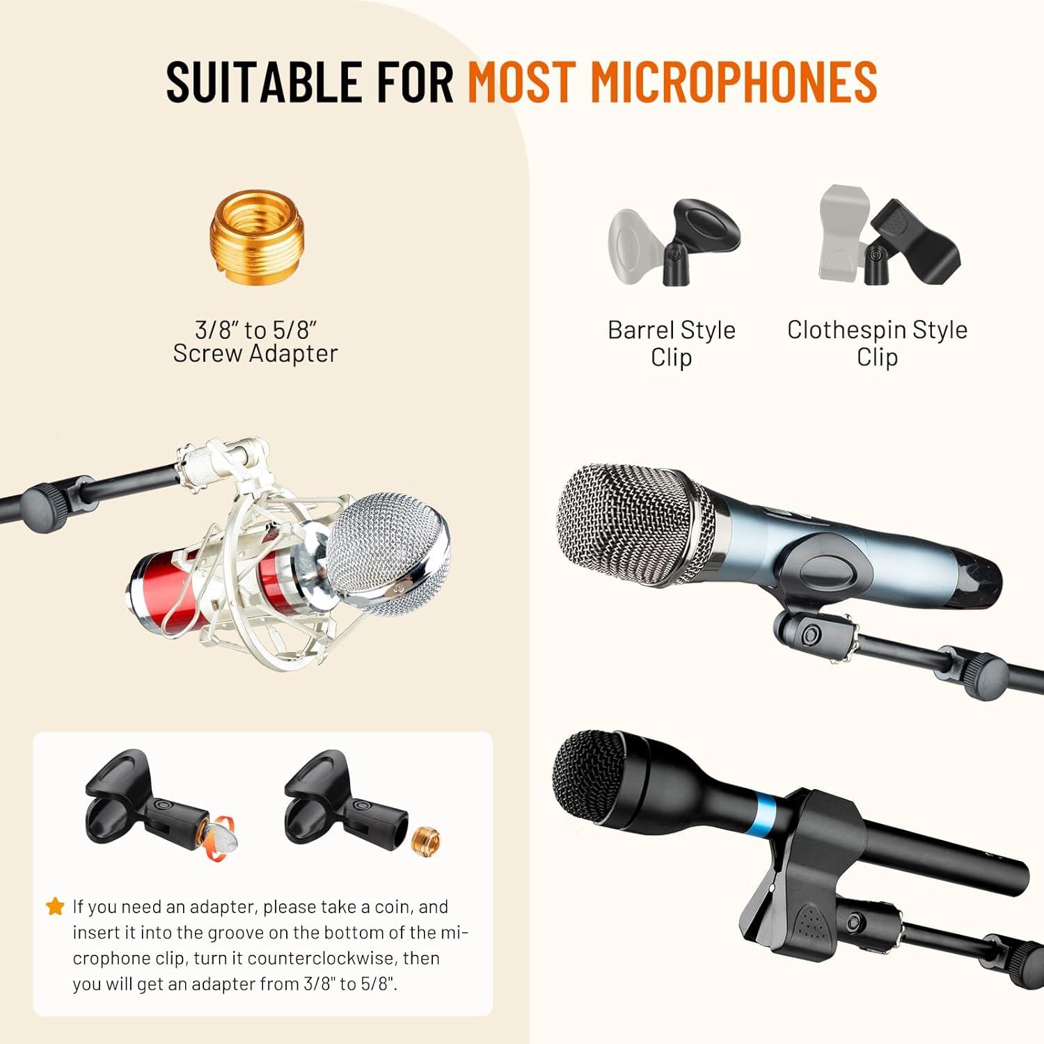 Two Microphone Clips Included: The CAHAYA mic stand also comes with two microphone clips (Clothespin Style+Barrel Style Clip) suitable for most common microphone models. If you need an adapter, you can unscrew the 3/8″ to 5/8″ adapter at the bottom. No additional accessories are required, meeting various microphone needs.