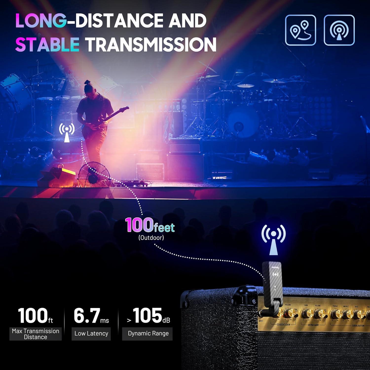 2.4GHz Wireless Guitar System: With a delay time of less than 6.7 milliseconds and a maximum range of 100 feet, this system delivers a high-performance, seamless wireless experience for musicians.