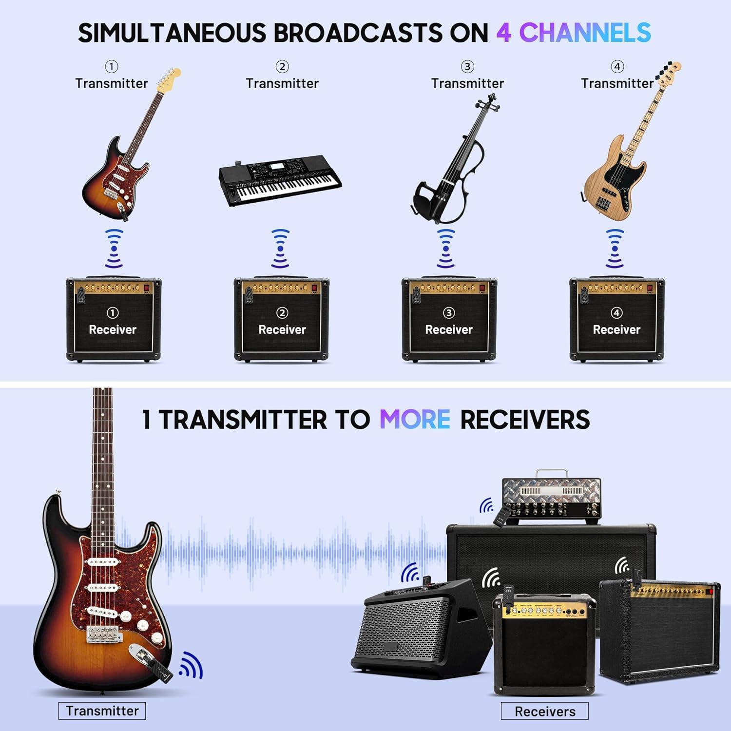 Simultaneous Use of 4 Devices: The audio transmission system supports versatile many-to-many configurations, allowing up to 4 transmitters and receivers to operate simultaneously on the same channel without signal interference. Alternatively, you can pair 1 transmitter with up to 4 receivers for seamless multi-device usage.
